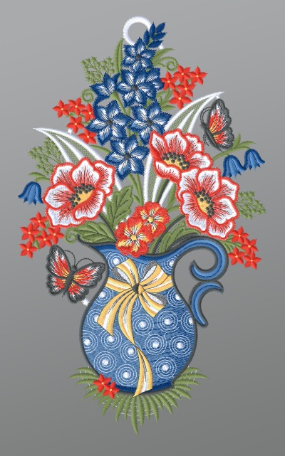 Fensterbild aus Plauener Spitze® - Blumenstrauß in Kanne #1W mehrfarbig