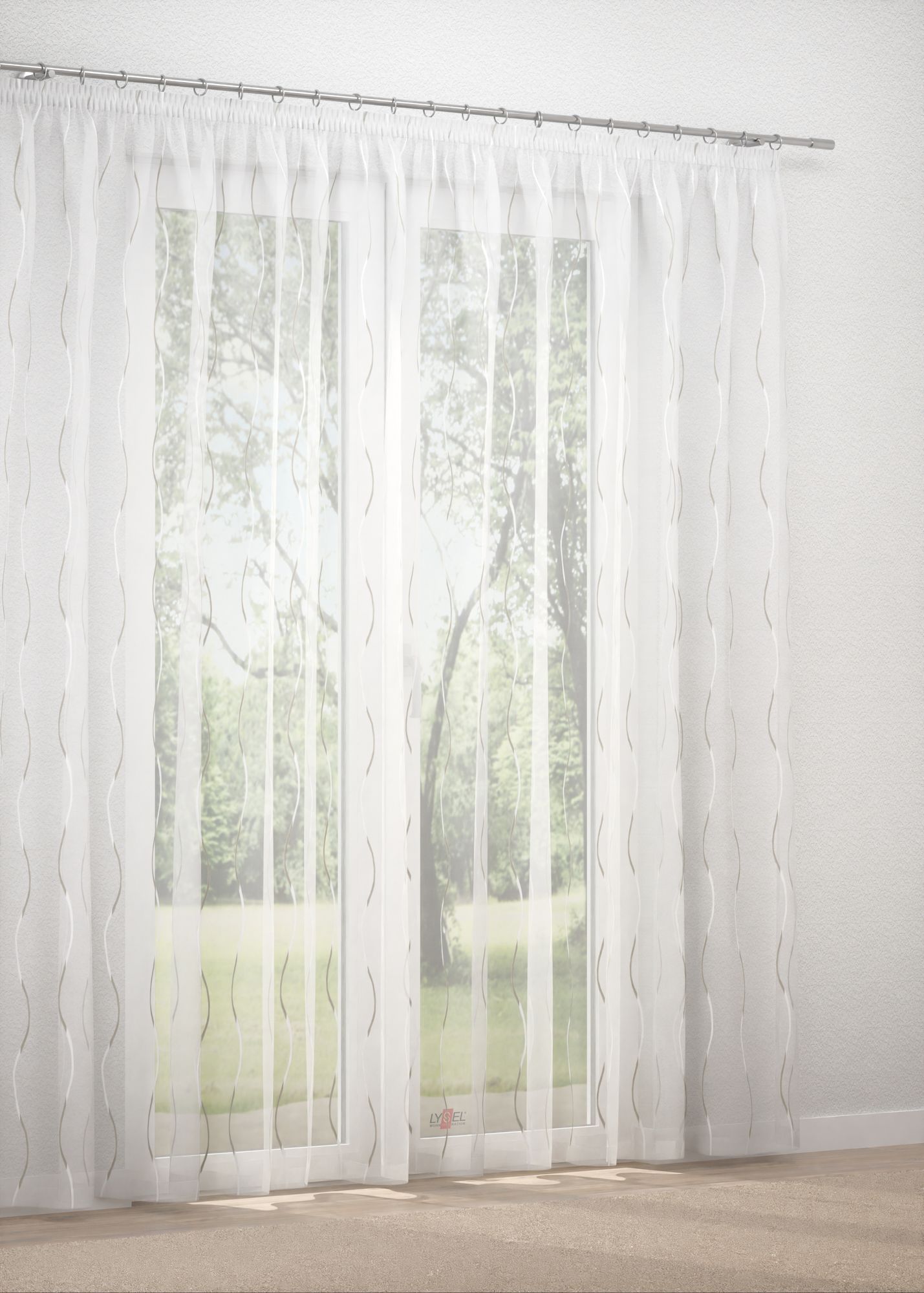 Mögen Sie es hell, freundlich und stilvoll, ist dieser Gardinenstoff genau das Richtige. Hingucker bei diesem Modell ist eine zweifarbige Wellenlinie, die sich sanft schimmernd vertikal durch die Stoffoberfläche zieht. Das moderne Muster in Scherli-Technik verbreitet ein vitales, ebenso elegantes Flair, das jedem Raum zu Gute kommt, egal, ob Sie den Behang als Scheibengardine in der Küche, Dekoschal im Schlafzimmer oder Raffrollo im Wohnzimmer einsetzen. Das eingearbeitete Bleiband sorgt überall für ein attraktives Erscheinungsbild. Durch die Transparenz des Polyesters bleiben Zimmer hell und freundlich, der Blick nach draußen stets gewahrt, sodass Sie sich ein Stück Natur und Freiheit in Ihre vier Wände holen können. Alles in allem ein Fensterschmuck mit dem gewissen Etwas, der pflegeleicht ist und bei 30°C schonend mit der Maschine gewaschen werden kann.