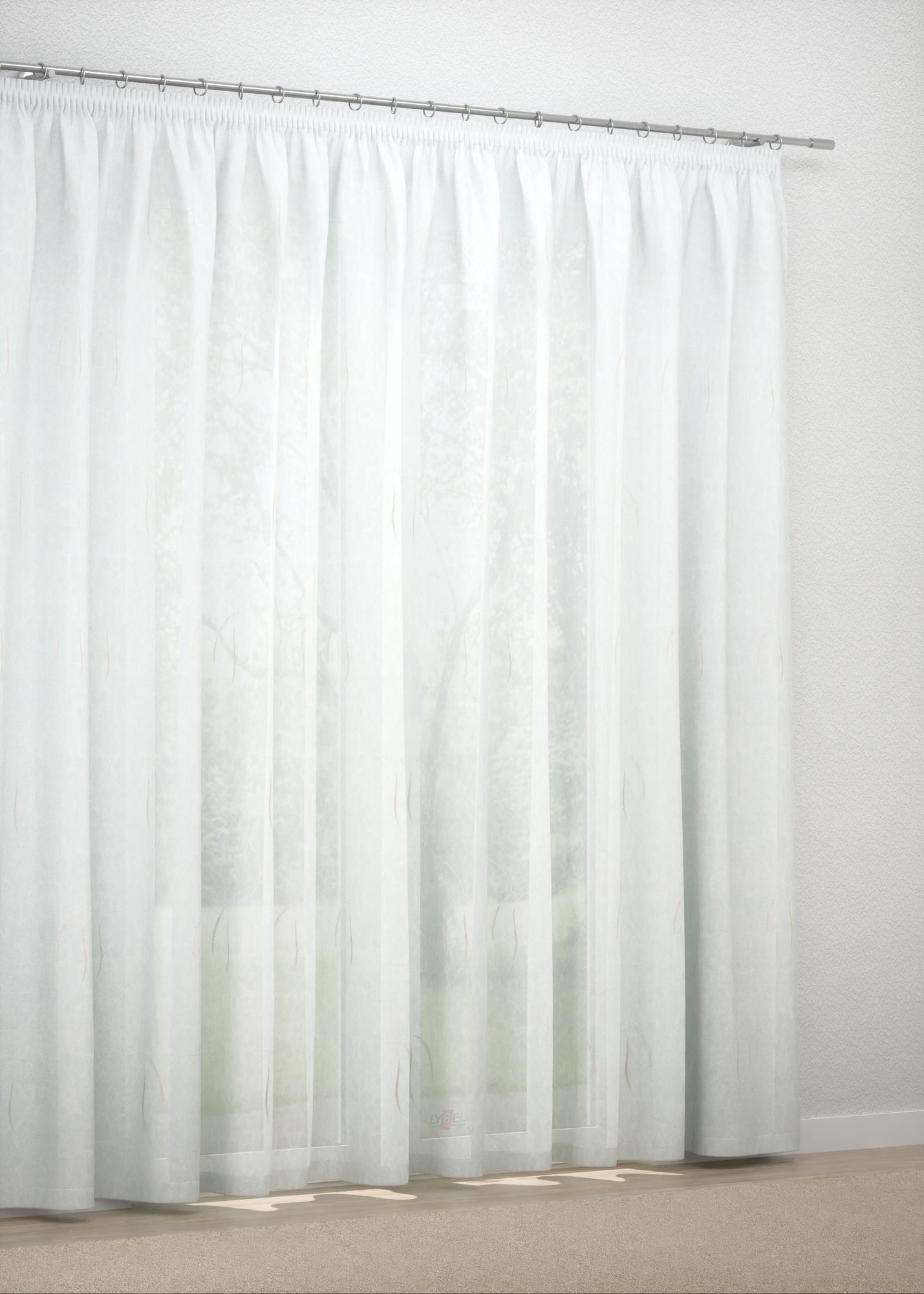 Der transparente Voilestoff verleiht dem Raum eine angenehme Luftigkeit und Leichtigkeit. Für lebendige Akzente sorgen die Crush-Struktur und die mit Effektgarn gestalteten, glänzenden Details, die in ihren geschwungenen Formen an Blätter oder Knospen erinnern können. Aus diesem Stoff können verschiedene Accessoires entstehen, zum Beispiel ein Gardinenschal nach Maß, der durch das Bleiband noch eleganter am Fenster herabfällt. Auch ein luftig-leichtes Raffrollo können Sie im Konfigurator zusammenstellen und dabei unter anderem die Aufhängung festlegen. Da das durchsichtige Gewebe viel Licht in den Raum lässt, wird dieser optisch vergrößert. Am Fenster erfüllt dieser Behang vor allem dekorative Zwecke. Nutzen Sie außerdem die Möglichkeit, den Stoff als Meterware zu bestellen. Dann können Sie Accessoires wie Deckchen und Tischläufer auch selbst nähen, das Design auf verschiedene Weise in den Raum integrieren und ein harmonisches Gesamtbild erzeugen.