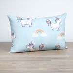 Dabei sind die Einhörner mit lilafarbenen Umrandungen und Schattierungen gestaltet, was sie noch magischer wirken lässt. Ihren Schweif und die Mähne präsentieren die Einhörner anmutig in den gedeckten Tönen Apricot, Himbeerrosa, Lindgrün und Pastellviolett. Die Farben des Regenbogens leuchten nochmal mehr. Eine Einrichtung in Blautönen, Weiß und Grau setzt das Design wirkungsvoll in Szene.