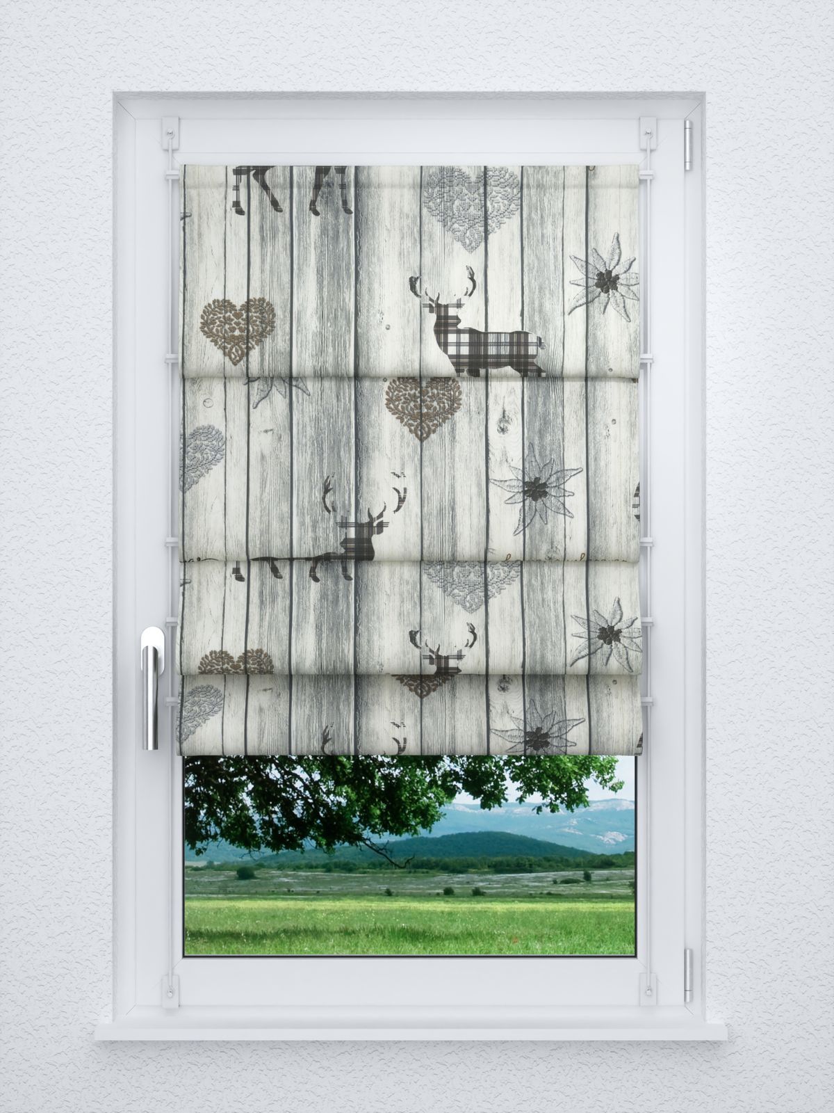 Das Design dieses Stoffes steht ganz im Zeichen der Natur. Der Hintergrund wirkt durch die senkrecht angeordneten Holzbretter mit einzigartiger Maserung rustikal, bringt ein gemütliches und heimeliges Flair in den Raum. Die detailgetreue Gestaltung und die abwechslungsreichen Akzente verleihen dem Design Ausdruck und das gewisse Etwas. Auf den Holzbrettern sind in unterschiedlichen Abständen Blumen, gestickte Herzen und mit Karomuster ausgefüllte Hirsche angeordnet, die das rustikale, naturverbundene Flair noch hervorheben. Das Motiv wurde per Digitaldruck auf die Vorderseite des Polyesterstoffes aufgebracht. Aus der Meterware können Sie verschiedene Accessoires kreieren und selbst nähen. Gleichzeitig bietet der Konfigurator vielfältige Möglichkeiten, um Ihre maßgefertigte Fensterdeko nach Ihren Wünschen zu gestalten. Das lichtdurchlässige Gewebe sorgt weiterhin für Helligkeit im Raum, gleichzeitig bietet es einen zuverlässigen Sichtschutz. Ob Raffrollo, Gardinenschal, Tischdecke oder Kissenbezug: Aus dem flexiblen Stoff kann vieles werden.