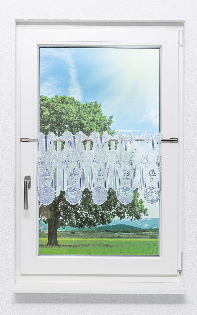 Leicht und erfrischend wirkt die mit blauen Elementen verzierte weiße Scheibengardine. Der luftige Charakter des maritimen Designs kommt durch die von Himmel und Meer inspirierten Töne besonders gut zum Ausdruck. Helle Erdfarben, die an Sand erinnern, Materialien wie Holz, Bast, Keramik, Leinen, Rattan und Seegras bringen die nötige Wärme und Wohnlichkeit mit.